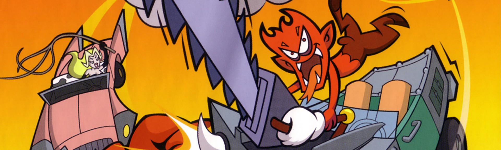 Back in 2001, Canadian studio Pseudo Interactive decided to have its own go at the genre with Cel Damage, a vehicular battle arena game which took the power-up collecting violence of Twisted Metal and fused it with the cartoon slapstick of Wacky Races. Without the actual licence for that Hanna-Barbera series, the developer instead used a similar cel-shaded look (back when cel-shading was still new and fresh) and created its own roster of madcap racers. There’s Fowl Mouth (a noir-style black and white duck), Sinder (a miniature demon), Dominique Trix (a dominatrix, unsurprisingly enough) and more. Each one has a unique item they can fling to knock enemies aside or reduce their health, but for the most part, they all have the same floaty, bumper car-style driving model.