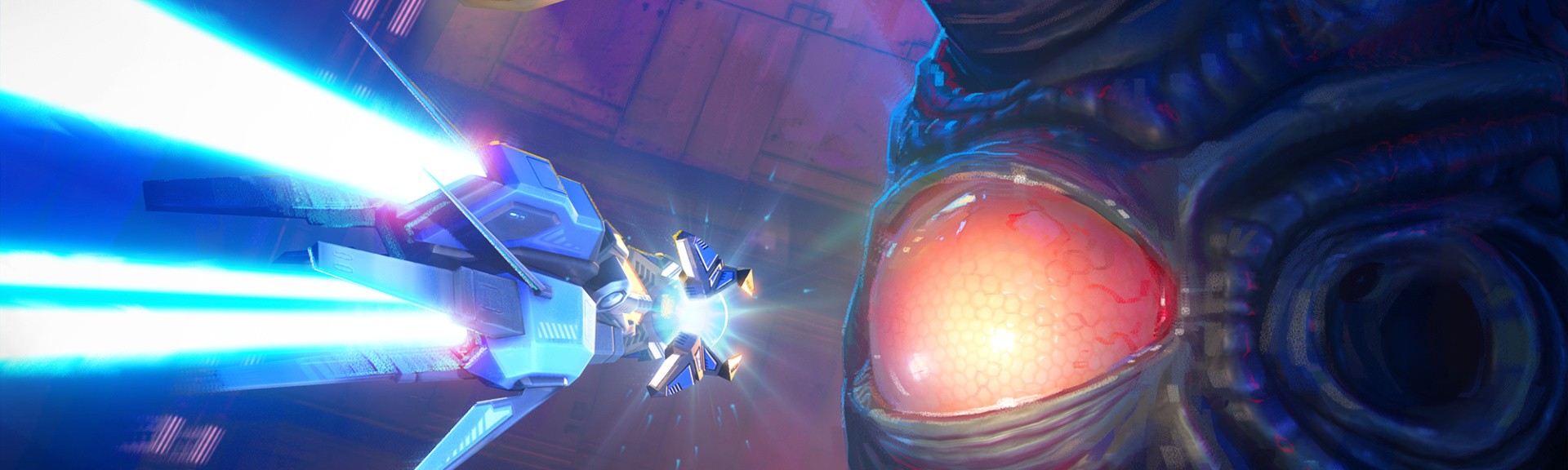 The game kicks off with a welcome tutorial showcasing all of the controls for your ship. Don’t skip it, as there is valuable information which is also very all nicely narrated in a choice three flavours (English, German and Japanese) by your ship’s AI, PSYE. Shmup instincts might lead your left thumb to the digital D-Pad by default, but this game presents proper analogue stick control and we found it to be essential when navigating some of the later levels, while boss battles require more finesse than is really possible with digital input. The precision movement is welcome, but the real star of the show here is the weapons system.