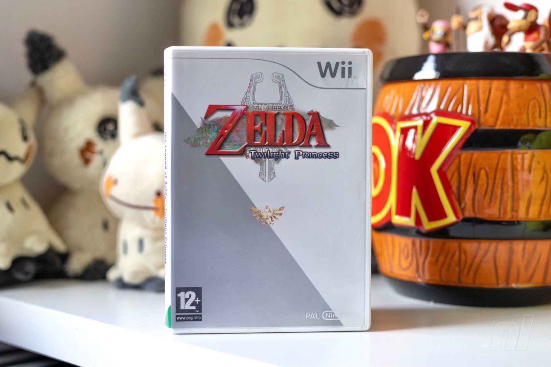 This boxed version of The Legend of Zelda: Twilight Princess looks like an unfinished version of the final art for the full game. The components of the key art are all there — namely, the diagonal colour split and the Triforce in the middle — but without Link or Wolf Link’s faces there, or the saturated yellow where the white is on the box.