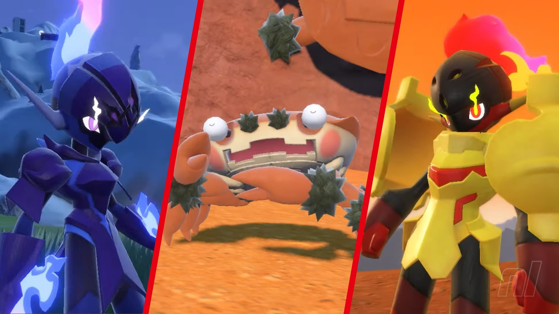 The other two Pokémon sort of come as a pair, and are version-exclusive opposites. The fiery Armarouge is unique to Scarlet, while the sleek Ceruledge is a Violet exclusive. We had to do a double take to make sure they weren’t Mega Man cameos, but they look very interesting.