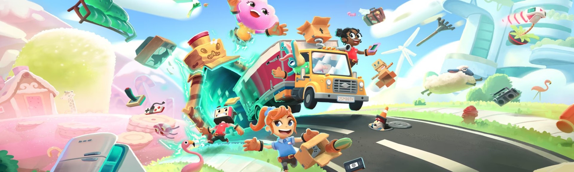 We return to the setting from the first game, but here Packmore is merely the suburban prelude to a multiverse full of imminent house moves. This time, you’ll be clumsily maneuvering couches through locales such as Pactropolis City, a metropolis in the clouds with an aesthetic evoking Wall-E’s clean sci-fi look. You’ll stow away a wizard’s spellbooks in the high fantasy world of Middle Folkmore – don’t worry, despite the name it’s reassuringly orc-free. And Snackmore copies a Mario Kart trademark with candified fields of tooth-rotting treats among a vast lake of melted chocolate.