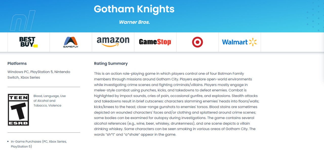 A rating by the ESRB in North America for the action role-playing spin-off Gotham Knights now also mentions the Nintendo Switch as a platform. The rating is ‘T’ for teen – with the game containing “blood, language use of alcohol and tobacco” and violence. Here’s the full rating summary:
