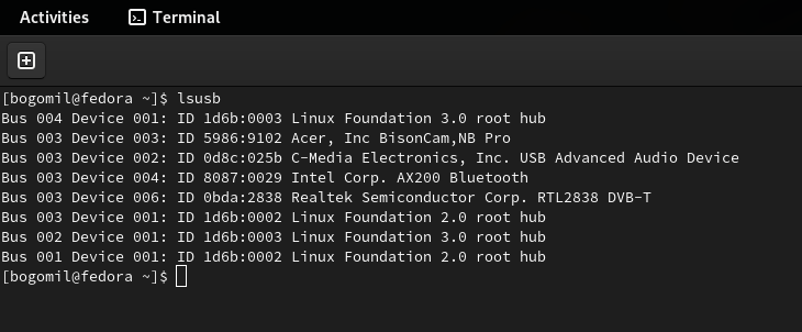 Before installing anything, detect whether Fedora Linux recognizes your USB dongle. I hope you didn’t buy a fake one :-). Use the following command to list the USB devices on your system.