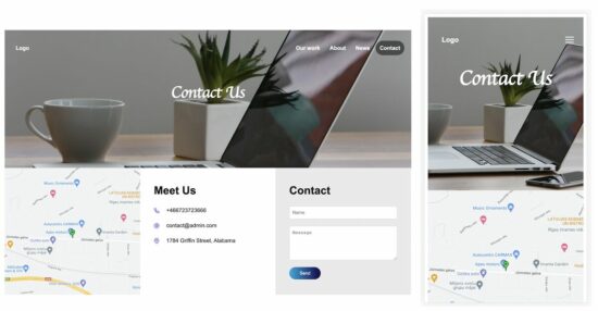 <body> <div class="container"> <div class="site-banner"> <div class="header-menu"> <a href="">Logo</a> <span id="menu-icon" on‌Click="toggleMenu()"><img src="images/menu.svg" /></span> <span id="header-right-menu"> <a href="#">Our work</a> <a href="#">About</a> <a href="#">News</a> <a href="#" class="header-active">Contact</a> </span> </div> <h1 class="heading">Contact Us</h1> </div><div class="footer"> <div class="footer-column"><img class="map-image" src="images/location.jpg" /></div> <div class="footer-column"> <div class="tile-content"> <h1>Meet Us</h1> <div class="contact-row"> <img src="images/phone.svg"><span class="tile-field">+466723723666</span> </div> <div class="contact-row"> <img src="images/at-sign.svg"><span class="tile-field">[email protected]</span> </div> <div class="contact-row"> <img src="images/map-pin.svg"><span class="tile-field">1784 Griffin Street, Alabama</span> </div> </div> </div> <div class="footer-column contact-form-container"> <div class="tile-content"> <form method="POST"> <h1>Contact</h1> <div class="contact-row"> <input type="text" class="form-field" placeholder="Name"> </div> <div class="contact-row"> <textarea rows="5" class="form-field" placeholder="Message"></textarea> </div> <button class="button">Send</button> </form> </div> </div> </div> </div> <script> function toggleMenu() { var menuElement = document.getElementById("header-right-menu"); if (menuElement.style.display === "block") { menuElement.style.display = "none"; } else { menuElement.style.display = "block"; } } </script>