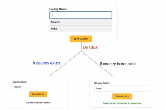 On key-up, a function executes the Jquery Autocomplete script. It reads suggestions based on entered value. This event handler is an AJAX function. It requests PHP for the list of related countries from the database.
