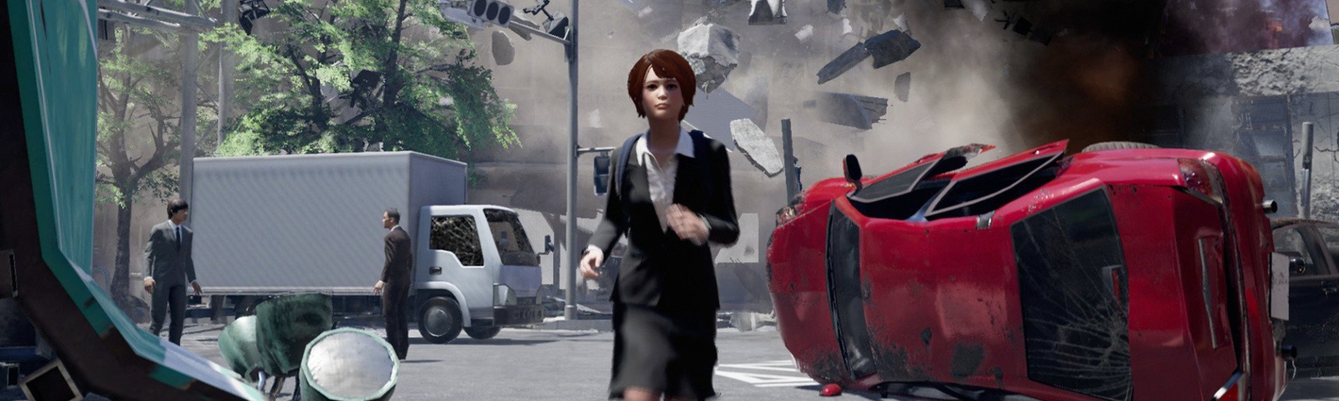 In Disaster Report 4, you take on the role of a customisable male or female protagonist as they arrive in the fictional (but distinctly Tokyo-inspired) Hisui City, ready for a job interview. Before you’re able to arrive at your destination, however, a massive earthquake strikes, causing the bus you’re riding to crash and the adventure proper to begin.