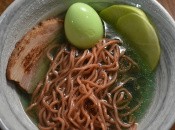 The dashi (a fishy soup base) was made by soaking kombu (a type of seaweed) in Baja Blast, a concoction Huy calls “Mountain Dewshi”. The shio tare (a seasoning sauce) and the broth were both made as standard, and not to gamer specifications, but the ajitama (marinated eggs) were placed in a container with more Mountain Dew, some sake, and mirin, turning them an unappetising green.