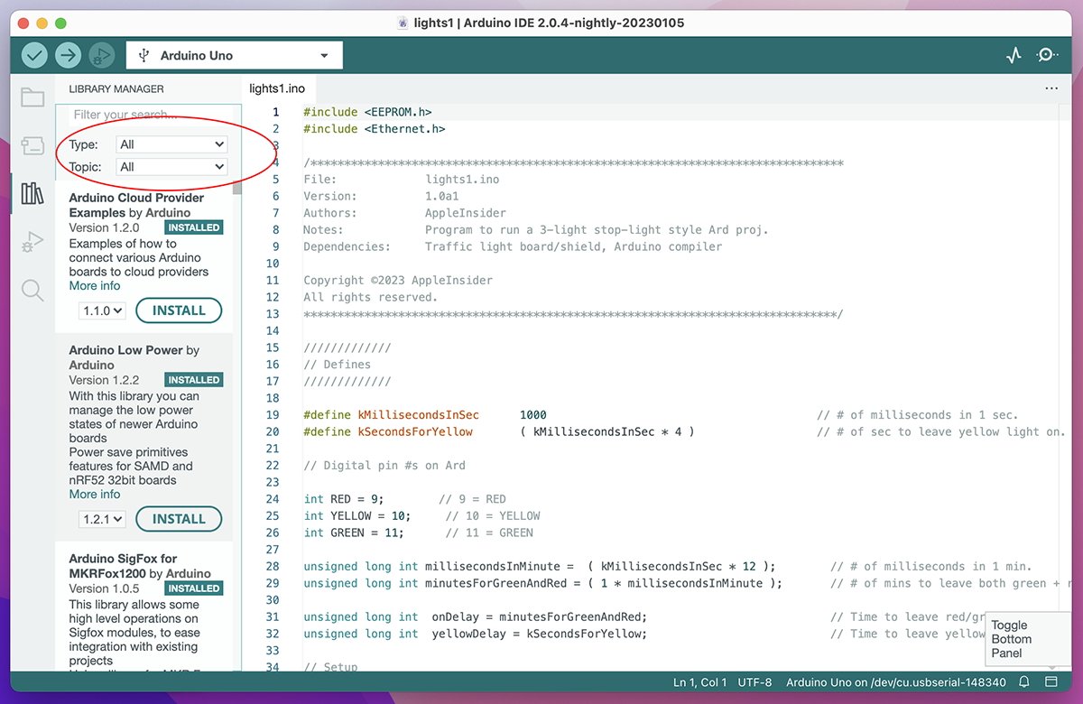 The Library Manager pane lets you download official and third-party libraries. Libraries are code bundles that add a specific functionality or device support to the IDE.