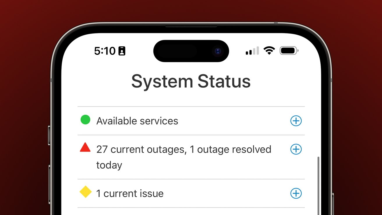 Apple’s system status page lists 27 outages across iCloud, business, school, and other services on Thursday afternoon.