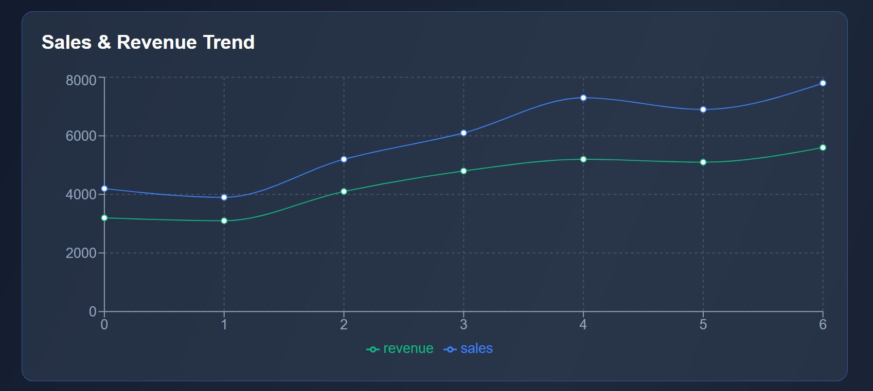 [Tut] React Charts and Graphs with Recharts: Visualize Data Beautifully - xSicKxBot - 12-12-2025 [Tut] React Charts and Graphs with Recharts: Visualize Data Beautifully <div style="margin: 5px 5% 10px 5%;"><img src="https://www.sickgaming.net/blog/wp-content/uploads/2025/12/react-charts-and-graphs-with-recharts-visualize-data-beautifully.jpg" width="550" height="288" title="" alt="" /></div><div><div class="modified-on" readability="7.1304347826087"> by <a href="https://phppot.com/about/">Vincy</a>. Last modified on December 3rd, 2025.</div> <p>Representing data in a chart view is a huge subject in Mathematics and Computer Science. If you have the skill to transform raw numbers into a chart view, it’s a brilliant representation that makes users understand any complex data quickly.</p> <p>Learning to build a chart in React will elevate your UI and make your application feel truly professional.</p> <p>This React example includes dashboard visualization to display the following chart view.</p> <ol> <li>Sales & revenue trend in the form of line chart.</li> <li>Product-wise performance using column chart.</li> <li>Browser distribution in <a href="https://phppot.com/javascript/chartjs-pie-chart/">pie chart</a>.</li> <li>Area chart to visualize users’ active time.</li> </ol> <p>It uses Recharts library to show the raw data in a graph or chart form, as shown below.</p> <p><img decoding="async" loading="lazy" class="alignnone size-large wp-image-24807" src="https://phppot.com/wp-content/uploads/2025/11/react-charts-graphs-recharts-data-visualization-550x288.jpg" alt="React Charts Graphs Recharts Data Visualization" width="550" height="288" srcset="https://phppot.com/wp-content/uploads/2025/11/react-charts-graphs-recharts-data-visualization-550x288.jpg 550w, https://phppot.com/wp-content/uploads/2025/11/react-charts-graphs-recharts-data-visualization-300x157.jpg 300w, https://phppot.com/wp-content/uploads/2025/11/react-charts-graphs-recharts-data-visualization-768x402.jpg 768w, https://phppot.com/wp-content/uploads/2025/11/react-charts-graphs-recharts-data-visualization.jpg 1200w" sizes="auto, (max-width: 550px) 100vw, 550px"></p> <h2>Main React component containing chart components</h2> <p>The DataVisualization component manages React states and useEffect. It manages the separate state variables for each type of charts.</p> <p>The React useEffect fetches the JSON data and set them to bind for the charts.</p> <p>The chart UI are created as separate components and used in the dashboard wrapper.</p> <p class="code-heading"><code>src/components/DataVisualization.jsx</code></p> <pre class="prettyprint"><code class="language-jsx">import { useState, useEffect } from "react"; import Header from "../components/Header"; import StatsCards from "../components/StatsCards"; import LineChartBox from "../components/LineChartBox"; import BarChartBox from "../components/BarChartBox"; import PieChartBox from "../components/PieChartBox"; import AreaChartBox from "../components/AreaChartBox"; import Footer from "../components/Footer"; const DataVisualization = () => { const [lineData, setLineData] = useState([]); const [barData, setBarData] = useState([]); const [pieData, setPieData] = useState([]); const [areaData, setAreaData] = useState([]); useEffect(() => { fetch("/data/dashboard.json") .then((res) => res.json()) .then((data) => { setLineData(data.lineData); setBarData(data.barData); setPieData(data.pieData); setAreaData(data.areaData); }) .catch((err) => console.error("Error loading data:", err)); }, []); return ( <div className="dashboard-wrapper"> <div className="dashboard-container"> <Header /> <StatsCards /> <div className="charts-grid"> <LineChartBox data={lineData} /> <BarChartBox data={barData} /> <PieChartBox data={pieData} /> <AreaChartBox data={areaData} /> </div> <Footer /> </div> </div> ); }; export default DataVisualization; </code></pre> <h2>Chart visualization header with trending data cards</h2> <p>In this code, the chart components are created for rendering in a dashboard. Added to the chart representation, the dashboard shows cards to display trending data.</p> <p>You can replace it with your applications progressive data in this cards. For demonstration purpose, they are all static data from the client-side. It’s a matter of minute to plug your dynamic data from the database.</p> <h2><img decoding="async" loading="lazy" class="alignnone size-large wp-image-24670" src="https://phppot.com/wp-content/uploads/2025/11/react-chart-graph-visualization-header-550x65.jpg" alt="react chart graph visualization header" width="550" height="65" srcset="https://phppot.com/wp-content/uploads/2025/11/react-chart-graph-visualization-header-550x65.jpg 550w, https://phppot.com/wp-content/uploads/2025/11/react-chart-graph-visualization-header-300x35.jpg 300w, https://phppot.com/wp-content/uploads/2025/11/react-chart-graph-visualization-header-768x91.jpg 768w, https://phppot.com/wp-content/uploads/2025/11/react-chart-graph-visualization-header-1536x181.jpg 1536w, https://phppot.com/wp-content/uploads/2025/11/react-chart-graph-visualization-header.jpg 1772w" sizes="auto, (max-width: 550px) 100vw, 550px"></h2> <p class="code-heading"><code>src/components/Header.jsx</code></p> <pre class="prettyprint"><code class="language-jsx">const Header = () => ( <header className="dashboard-header"> <h1>Data Visualization Dashboard</h1> <p>Beautiful charts and graphs powered by Recharts in React</p> </header> ); export default Header; </code></pre> <p><img decoding="async" loading="lazy" class="alignnone size-large wp-image-24671" src="https://phppot.com/wp-content/uploads/2025/11/react-chart-graph-statscards-550x93.jpg" alt="react chart graph statscards" width="550" height="93" srcset="https://phppot.com/wp-content/uploads/2025/11/react-chart-graph-statscards-550x93.jpg 550w, https://phppot.com/wp-content/uploads/2025/11/react-chart-graph-statscards-300x50.jpg 300w, https://phppot.com/wp-content/uploads/2025/11/react-char